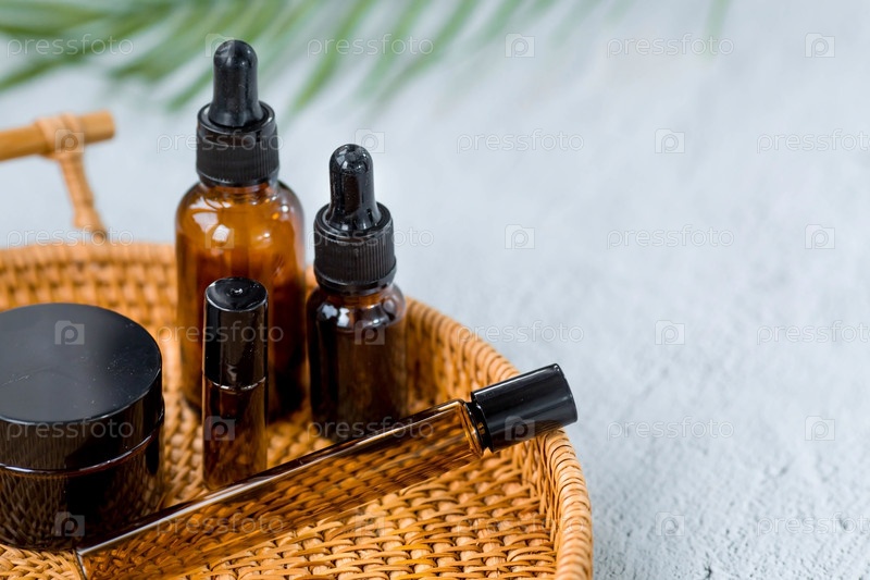 Ароматерапия. На подносе из ротанга стояла стеклянная бутылка с пипеткой для масла, лосьона, крема, массажная щетка и пальмовый лист. Натуральная органическая экокосметика. Макет брендинга салона красоты