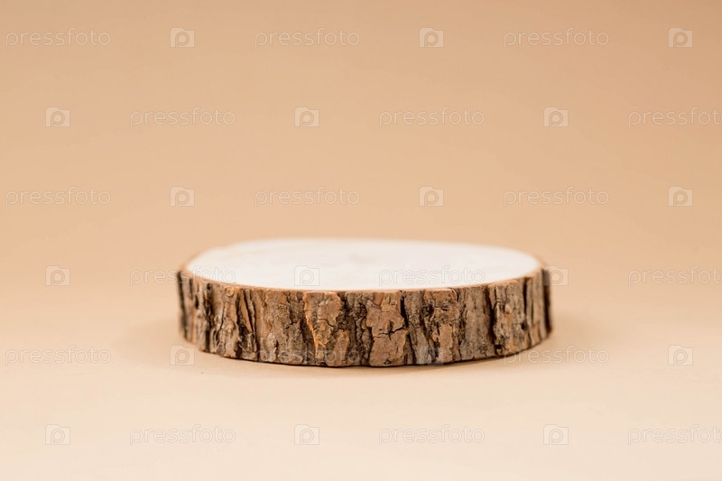 Деревянный спил. Цилиндрическая форма для презентации продукта на бежевом фоне. Эко-стиль и минимализм. Красота и косметика