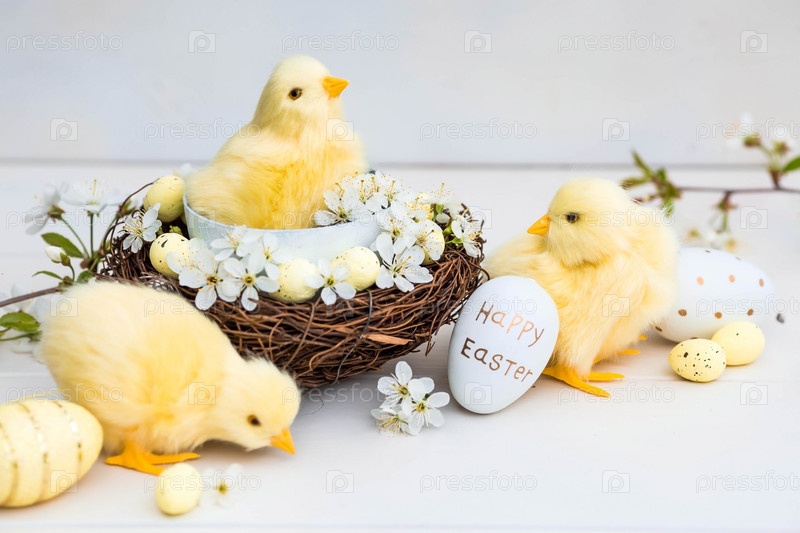 Золотые, желтые, белые яйца в птичьем гнезде, ветки сакуры и милые желтые цыплята на белом деревянном фоне. Минимальная концепция. Пасхальная открытка 2022 с копией места для текста