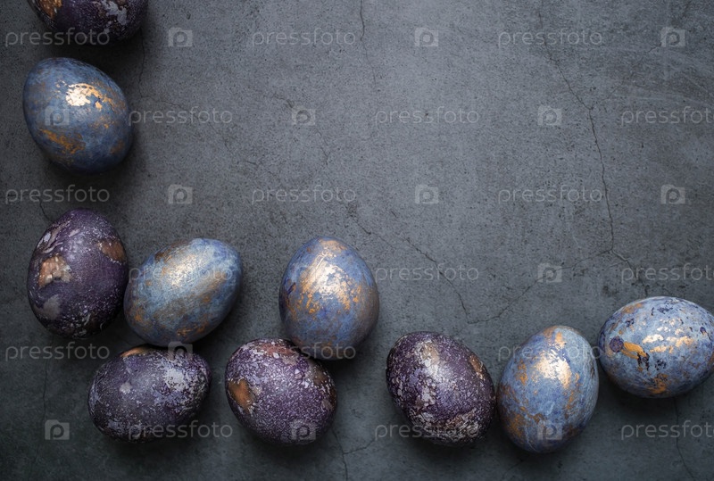Пасхальная открытка с копией места для текста. Фиолетовые, синие и золотые яйца на темном фоне. Тенденция фиолетового оттенка 2022 года очень актуальна. Чай каркаде с натуральным красителем. Вид сверху