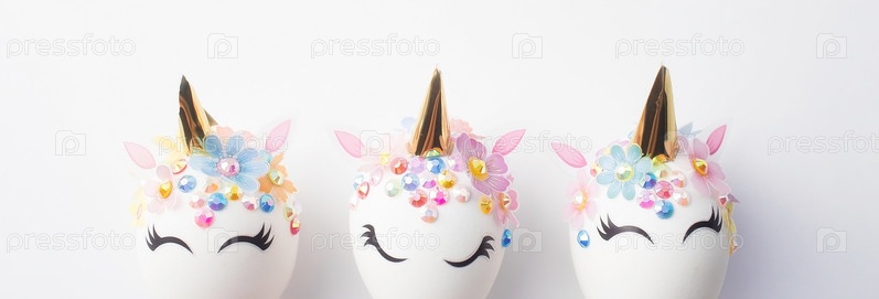 Баннер. Пасхальные яйца в виде единорога и с золотым узором на белом фоне. Плоская укладка. Скопируйте место для текста