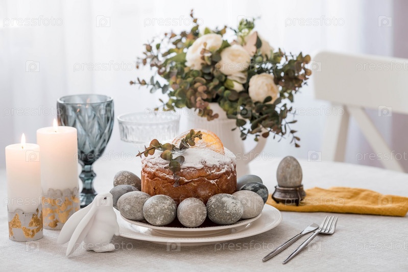 Весенняя сервировка стола. Тарелка с хлопковой салфеткой с зайчиком, тортом и пасхальными яйцами. Столовое серебро, пасхальные кролики и ваза с цветами на льняной скатерти. Концепция светлого праздника Пасхи