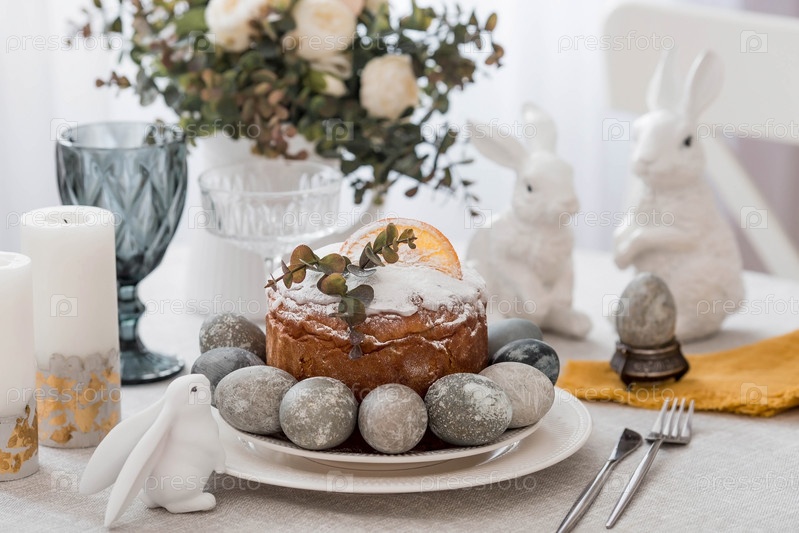 Весенняя сервировка стола. Тарелка с хлопковой салфеткой с зайчиком, тортом и пасхальными яйцами. Столовое серебро, пасхальные кролики и ваза с цветами на льняной скатерти. Концепция светлого праздника Пасхи