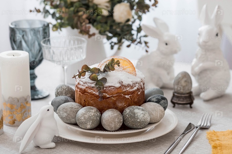 Весенняя сервировка стола. Тарелка с хлопковой салфеткой с зайчиком, тортом и пасхальными яйцами. Столовое серебро, пасхальные кролики и ваза с цветами на льняной скатерти. Концепция светлого праздника Пасхи