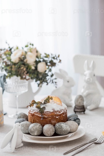 Весенняя сервировка стола. Тарелка с хлопковой салфеткой с зайчиком, тортом и пасхальными яйцами. Столовое серебро, пасхальные кролики и ваза с цветами на льняной скатерти. Концепция светлого праздника Пасхи