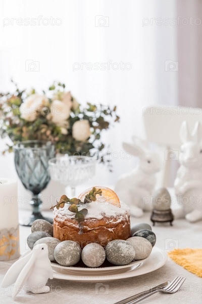 Весенняя сервировка стола. Тарелка с хлопковой салфеткой с зайчиком, тортом и пасхальными яйцами. Столовое серебро, пасхальные кролики и ваза с цветами на льняной скатерти. Концепция светлого праздника Пасхи