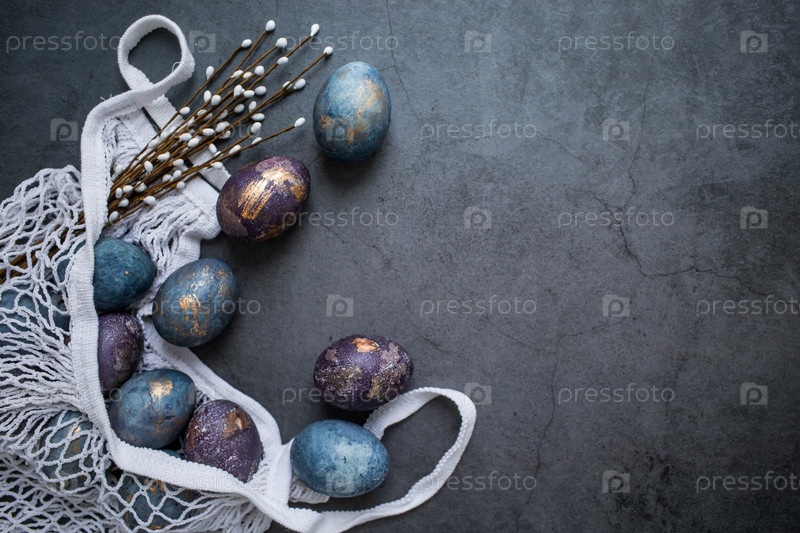 Пасхальная открытка с копией места для текста. Фиолетовые, синие и золотые яйца в авоське на темном фоне. Тенденция 2022 года – фиолетовый оттенок очень пери. Чай каркаде с натуральным красителем. Вид сверху