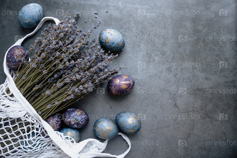 Пасхальная открытка с копией места для текста. Фиолетовые, синие и золотые яйца с букетом лаванды в авоське на темном фоне. Тенденция фиолетового оттенка 2022 года очень опасна