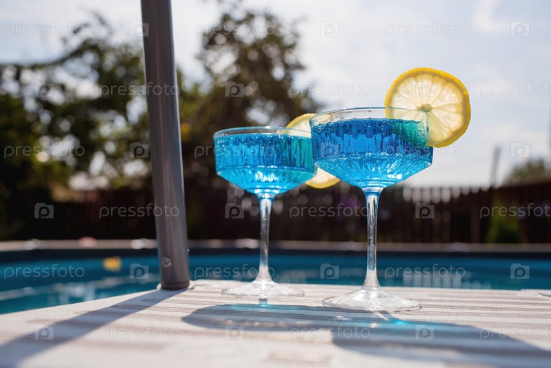Стакан вкусного голубого коктейля Голубая лагуна и желтые лимоны на фоне бассейна. Алкогольный коктейль из сочных фруктов блю с ликером кюрасао, кубиками льда и долькой лимона
