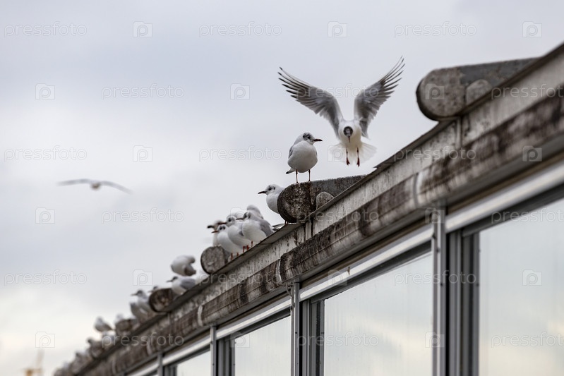 Турция. Стамбул. Городские птицы. Стадо ястребов сидит на крыше. Турция. Стамбул. Горные птицы. Группа чайков сидит на крыше