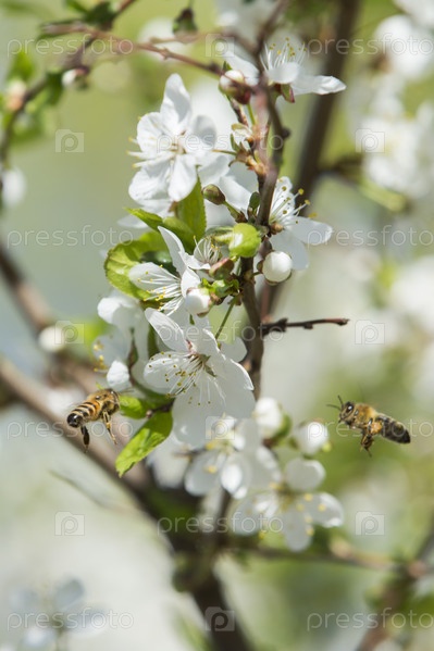 Россия. Санкт-Петербург. Пчелы собирают нектар с цветов яблони. Жизнь насекомых. Россия. Санкт-Петербург. Пчелы собирают нектар на цветах яблоня. Жизнь насекомого
