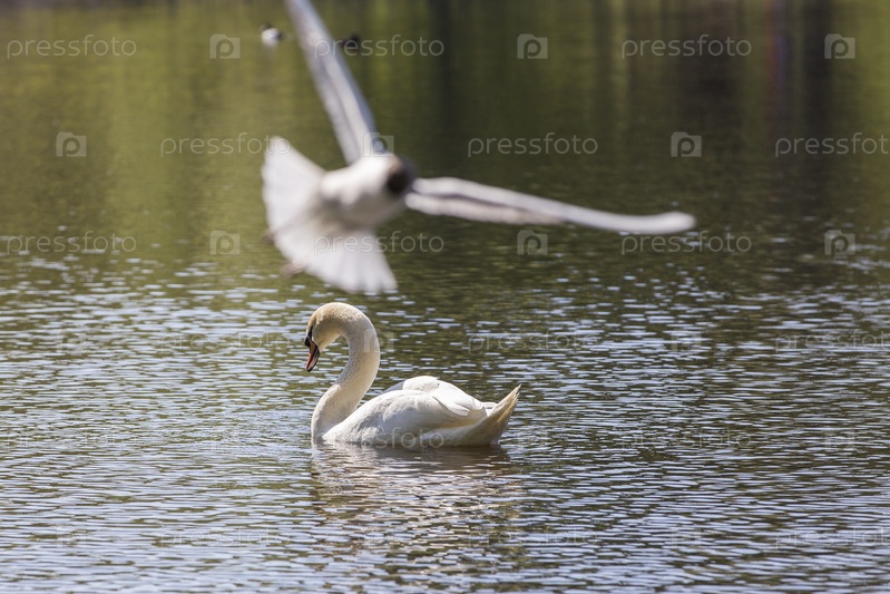 Россия. Санкт-Петербург. Лебедь на поверхности пруда на острове Крестовский. Россия. Санкт-Петербург. Лев на поверхности пруда на острове Крестовский