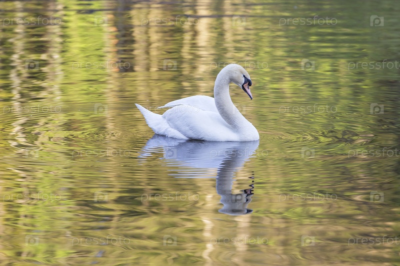 Россия. Санкт-Петербург. Лебедь на поверхности пруда на острове Крестовский. Россия. Санкт-Петербург. Лев на поверхности пруда на острове Крестовский