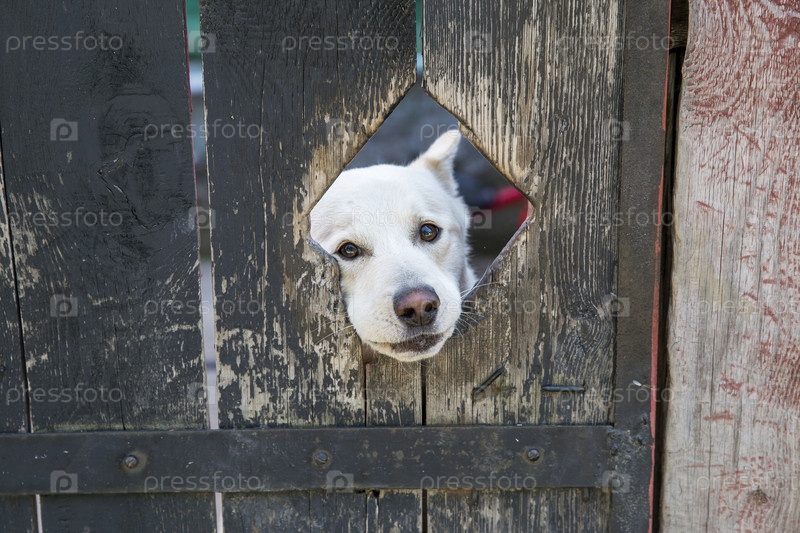 Россия. Листянка. Домашние животные. Охранная собака вытягивает рот в дыру за оградой. Хранительская собака ставит свою морду в отверстие в заборе
