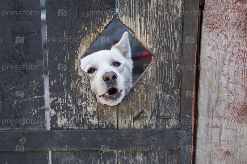 Россия. Листянка. Домашние животные. Охранная собака вытягивает рот в дыру за оградой. Хранительская собака ставит свою морду в отверстие в заборе