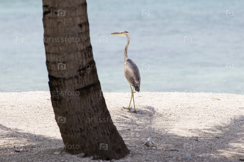 Мальдивская Республика. Остров Гурайду. Виды Мальдивов. Серая цапля на берегу Индийского океана. Республика Мальдивы. Остров Куреду. Мнения о Мальдивских островах. Серый гребец на побережье Индийского океана