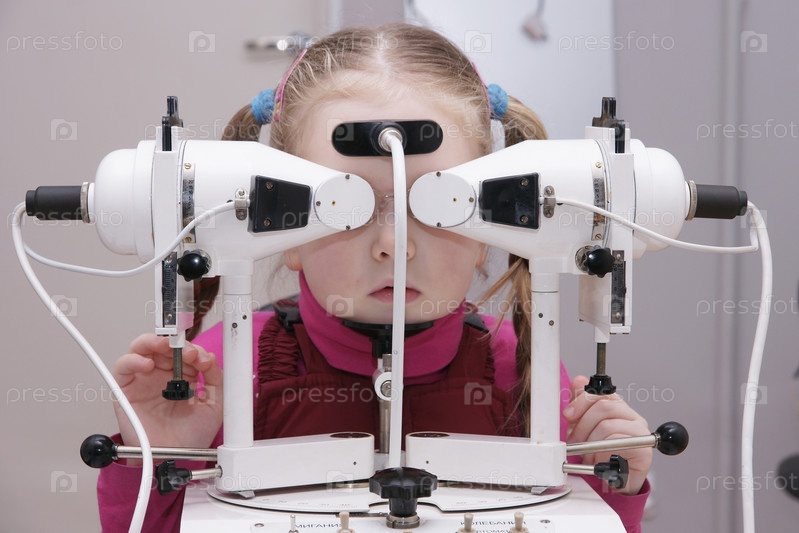 Россия. Санкт-Петербург. Проверка зрения. Девочка проходит проверку зрения на специальном офтальмологическом оборудовании. Россия. Сент-Петербург. Проверить зрение. Девушка проходит тест зрения на специальном офтальмологическом оборудовании