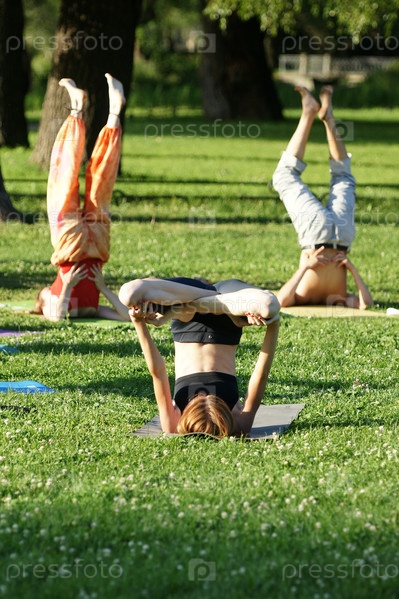 Россия. Санкт-Петербург. Горожане занимаются йогой на газоне в парке. Россия. Санкт-Петербург. Граждане делают йогу на лужайке в парке