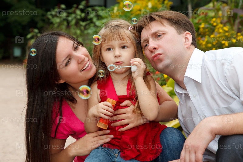 Семья в парке пускают мыльные пузыри