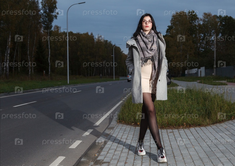 Молодая девушка в сером пальто стоит возле дороги, пытаясь остановить машину