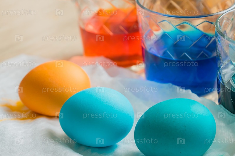 Процесс окрашивания пасхального яйца. Прозрачные стеклянные чашки с цветной водой. Крашеные яйца на переднем плане