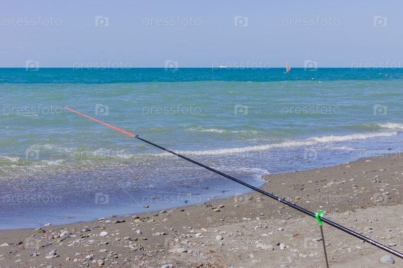 Две удочки на морском пляже. Концепция рыболовного туризма и отдыха