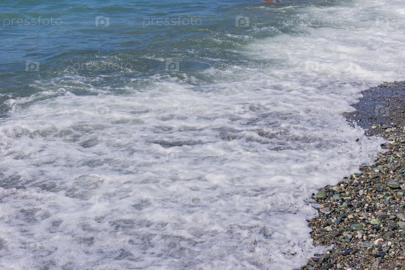 Галечная береговая линия. Морской берег с прозрачной водой и мелкими камнями