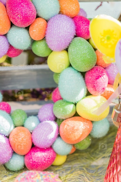 Пасхальный дверной венок крупным планом. Праздничное оформление дверей к пасхальным праздникам