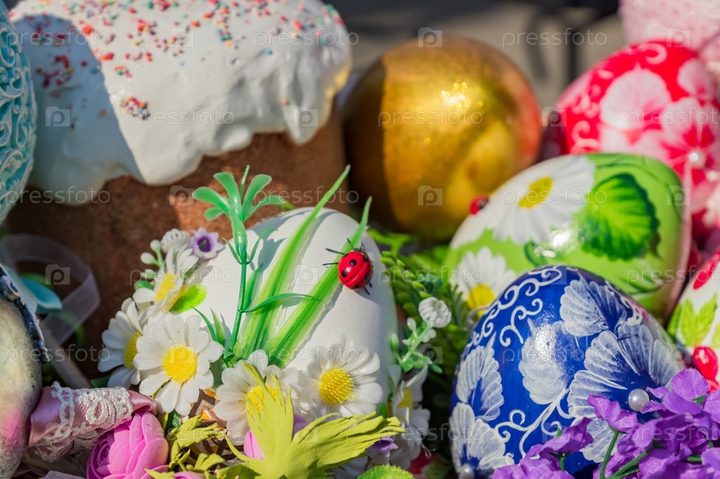 Вестиваль на Пасхальной улице в Москве, Россия. Плетеная корзина с расписными пасхальными яйцами, тортом и цветами