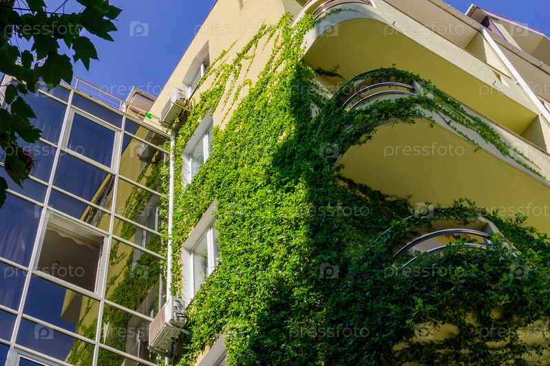 Вид снизу на красивое здание с натуральной стеной. Украшение патио