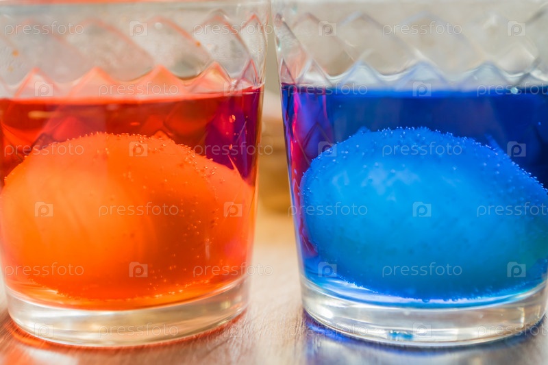 Очки с яйцами в разноцветной красящей воде, крупный план
