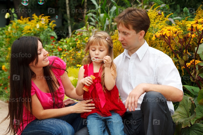 Семья в парке пускают мыльные пузыри