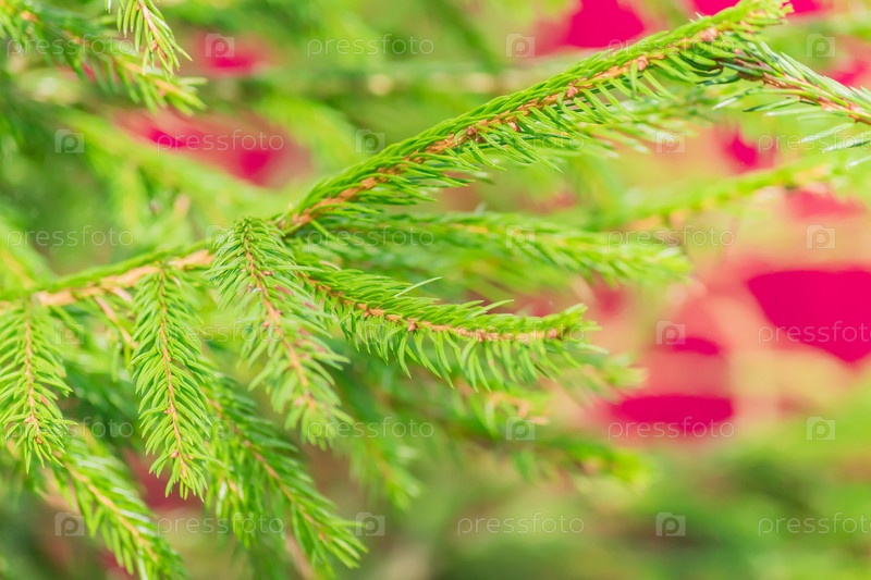 Крупным планом молодой ветви хвойного дерева. Ярко-зеленые иголки на красном фоне
