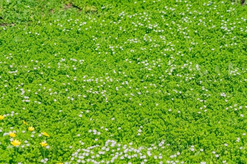 Поле маленьких белых цветущих цветов в солнечный день. Цветущий луг
