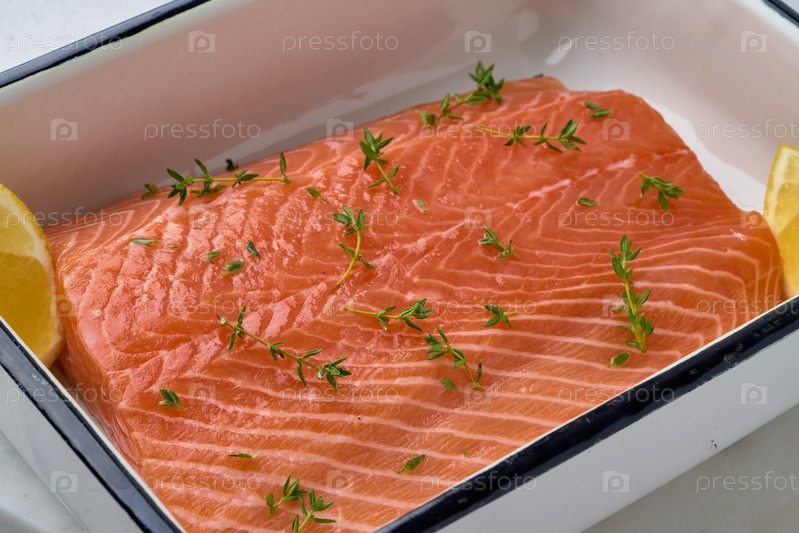 Свежее сырое филе лосося с зеленью и ломтиками лимона крупным планом
