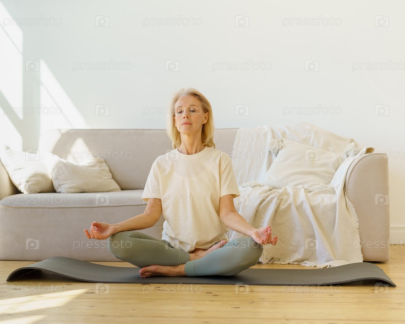 Пенсионерка медитирует и занимается йогой, сидя дома в позе лотоса на полу