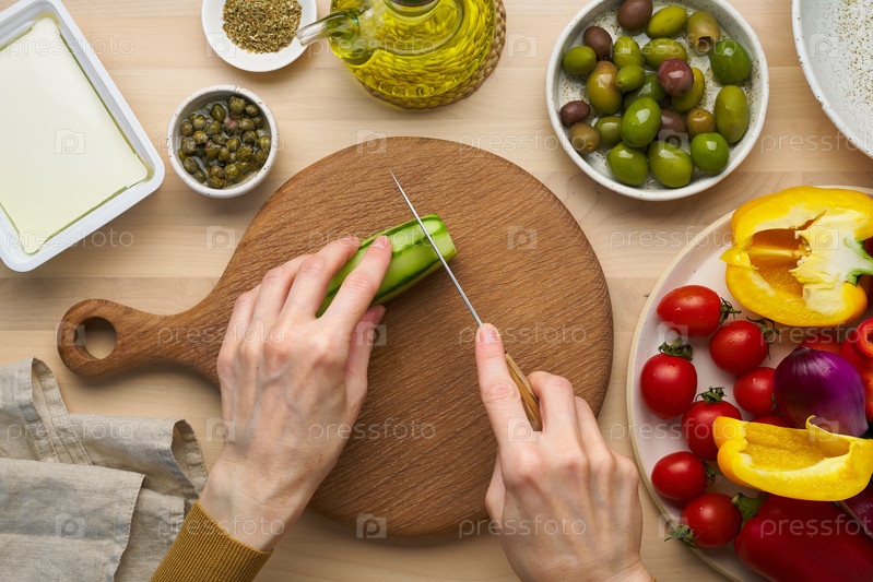 Вегетарианская пища. Нарезка огурцов, нарезка овощей для греческого салата хориатики