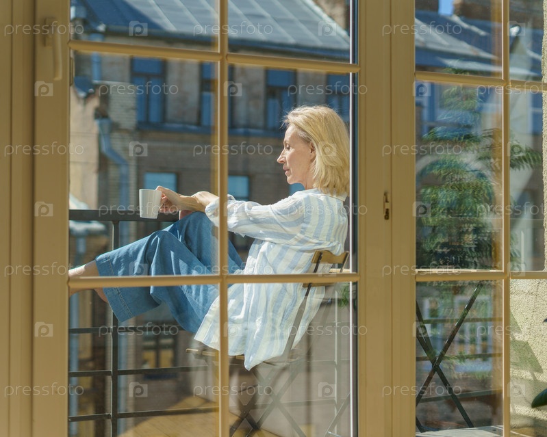 Счастливая пожилая женщина сидит на террасе с чашкой кофе и наслаждается солнечным утром