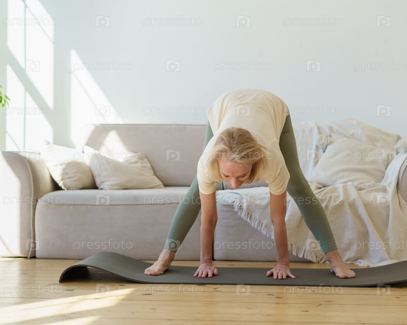 Активная здоровая пожилая женщина, стоящая в позе собачьей йоги лицом вниз во время занятий йогой дома