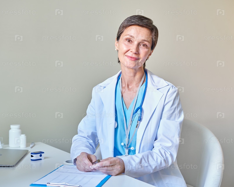 Улыбающаяся женщина-врач средних лет со стетоскопом на плечах в белом халате работает в клинике