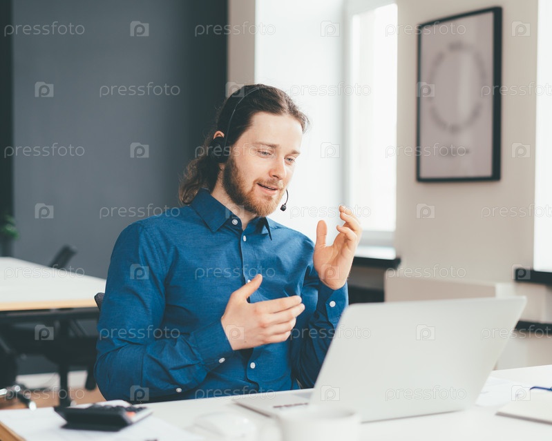 Улыбающийся молодой менеджер-мужчина в гарнитуре и формальной одежде разговаривает с клиентом на ноутбуке в офисе