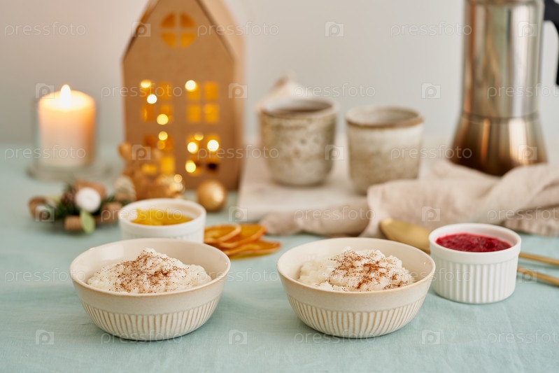 Рождественская еда. Рисовый пудинг. Французский молочный рисовый десерт. Пастельная уютная атмосфера утреннего праздника