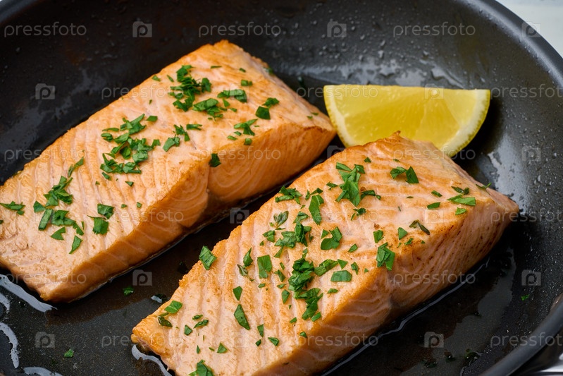 Крупный план жареного сочного филе лосося с петрушкой и лимоном на сковороде