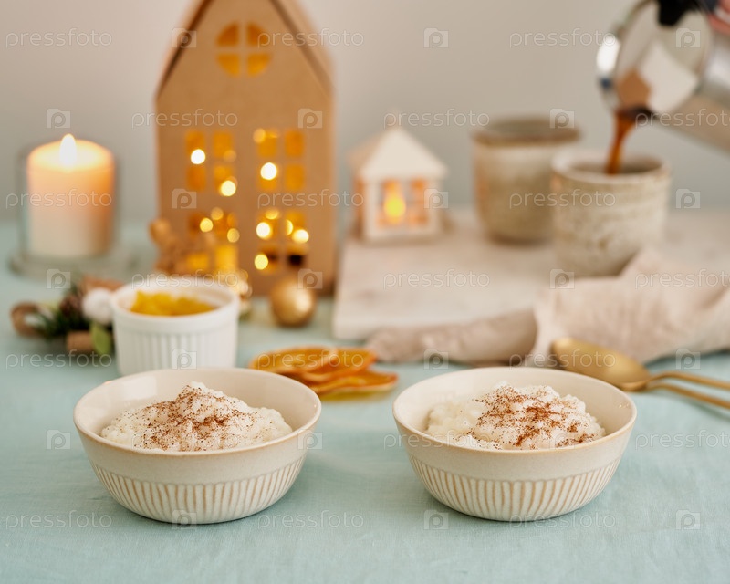 Безликий человек наливает кофе из кофеварки в чашку. Рождественская еда. Рисовый пудинг