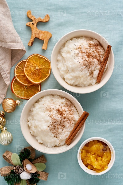 Рождественская еда. Рисовый пудинг. Французский молочный рисовый десерт. Две чаши. здорового веганского диетического завтрака