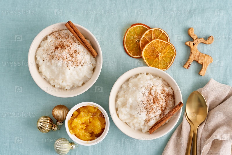 Зимняя комфортная еда с рождественским украшением на цветном льняном текстиле. Рисовый пудинг