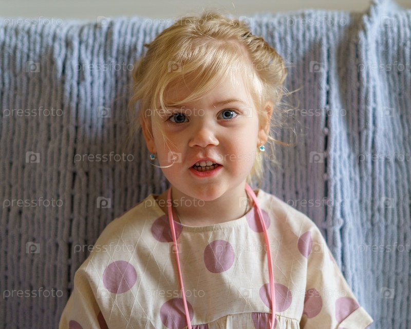 Очаровательная маленькая девочка с голубыми глазами и золотыми волосами смотрит в камеру