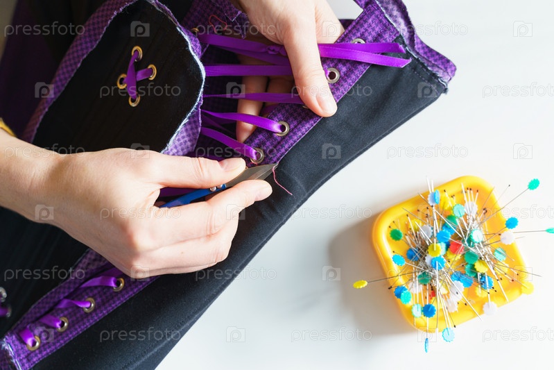Женщина-швея или портной с помощью ножниц при шитье корсета