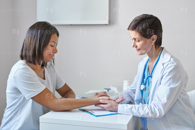 Женщина-врач средних лет в белом халате измеряет пульс на запястье пациента во время визита к врачу