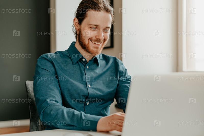 Улыбающийся молодой мужской офисный работник, печатающий на клавиатуре и смотрящий на экран ноутбука в офисе